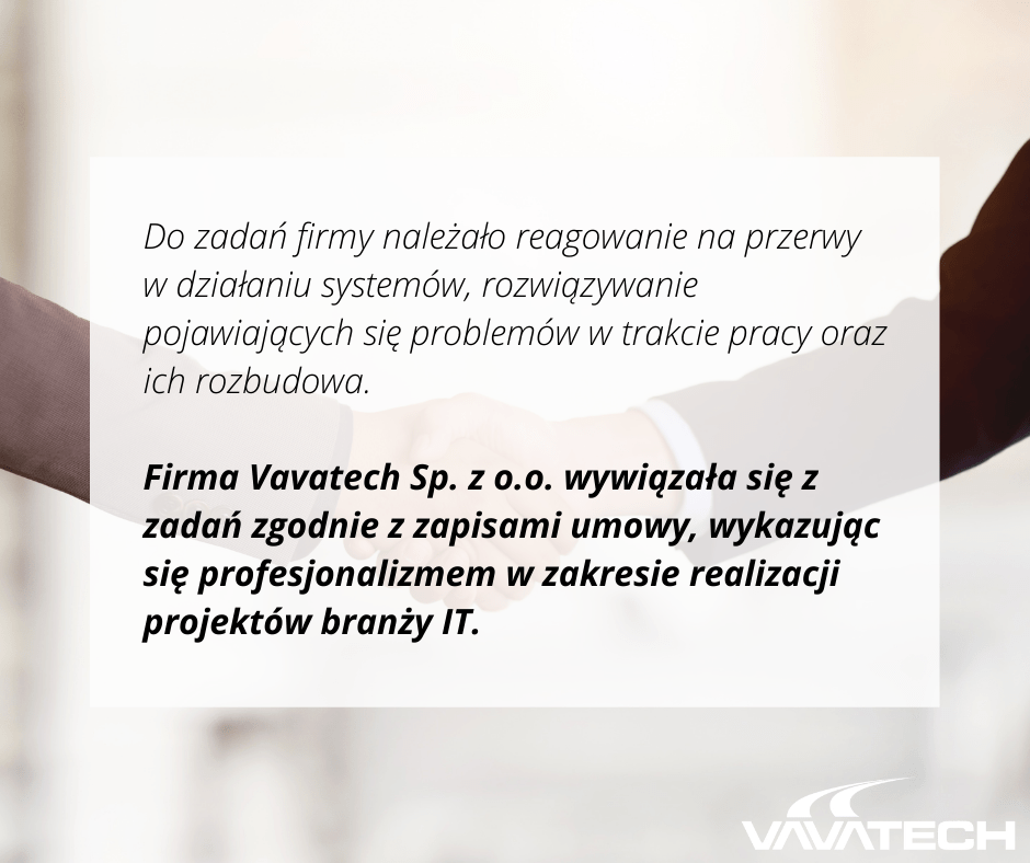 „Firma Vavatech Sp. z o.o. wywiązała się z zadań zgodnie z zapisami umowy, wykazując się profesjonalizmem w zakresie realizacji projektów z branży IT.”, pisze Pan Grzegorz Walter – Komendant Główny Ochotniczych Hufców Pracy.”